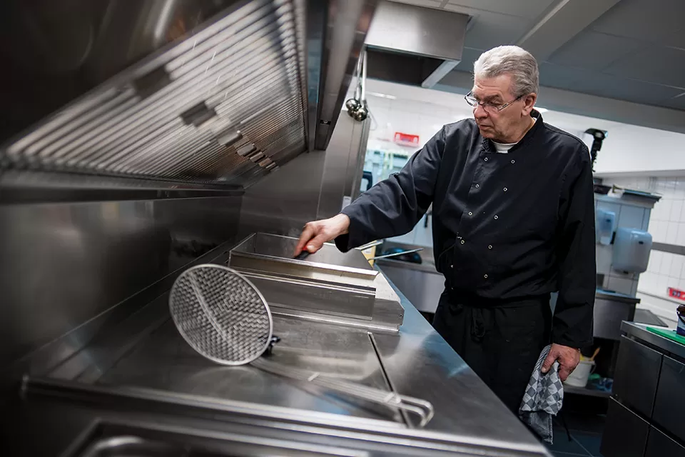 Deze Qook! wandopstelling is voorzien van een verlaagde afzuiging, zodat er boven op de oven bergruimte is. De robuust vormgegeven randen geven de wandopstelling het stoere Qook! uiterlijk. De wandopstelling bestaat uit een frituur- en visketel, een Adieu bakplaat, werkplateau, bain-marie en heeft een plateau ten behoeven van de combisteamer. Bovendien is de keuken voorzien van een volledig automatisch vet filtreersysteem. Kortom, een praktisch en robuust wandmeubel voorzien van de nodige kookelementen om van iedere maaltijd een feestje te kunnen maken.